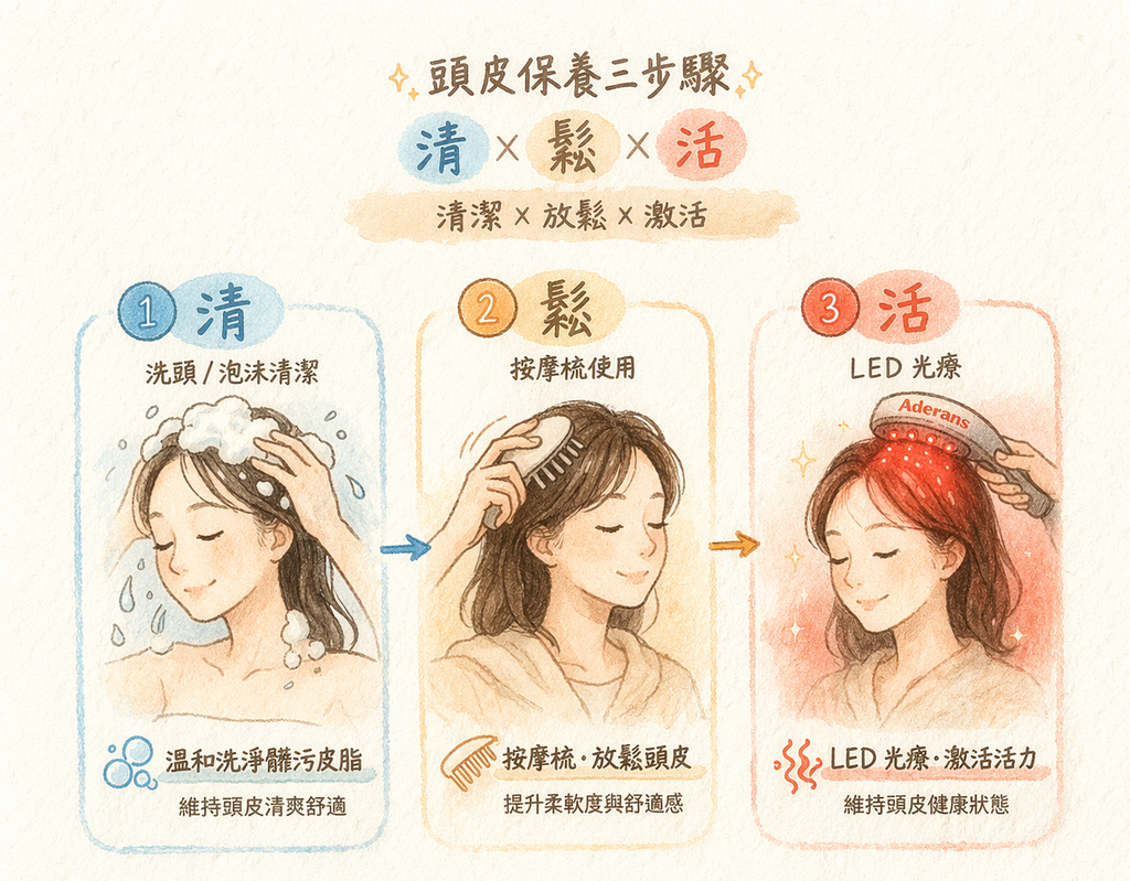 搭配LED紅光等保養工具,作為日常護理的一部分,有助於維持頭皮健康狀態。