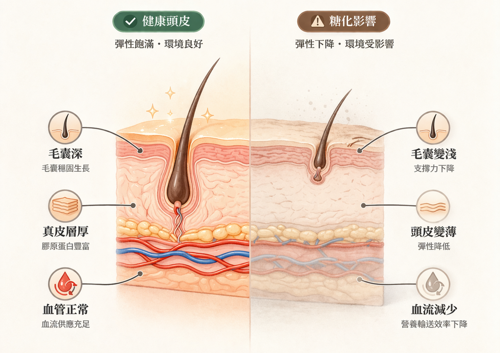 頭皮糖化可能與頭皮環境變化相關,但掉髮原因多元,建議綜合評估。
